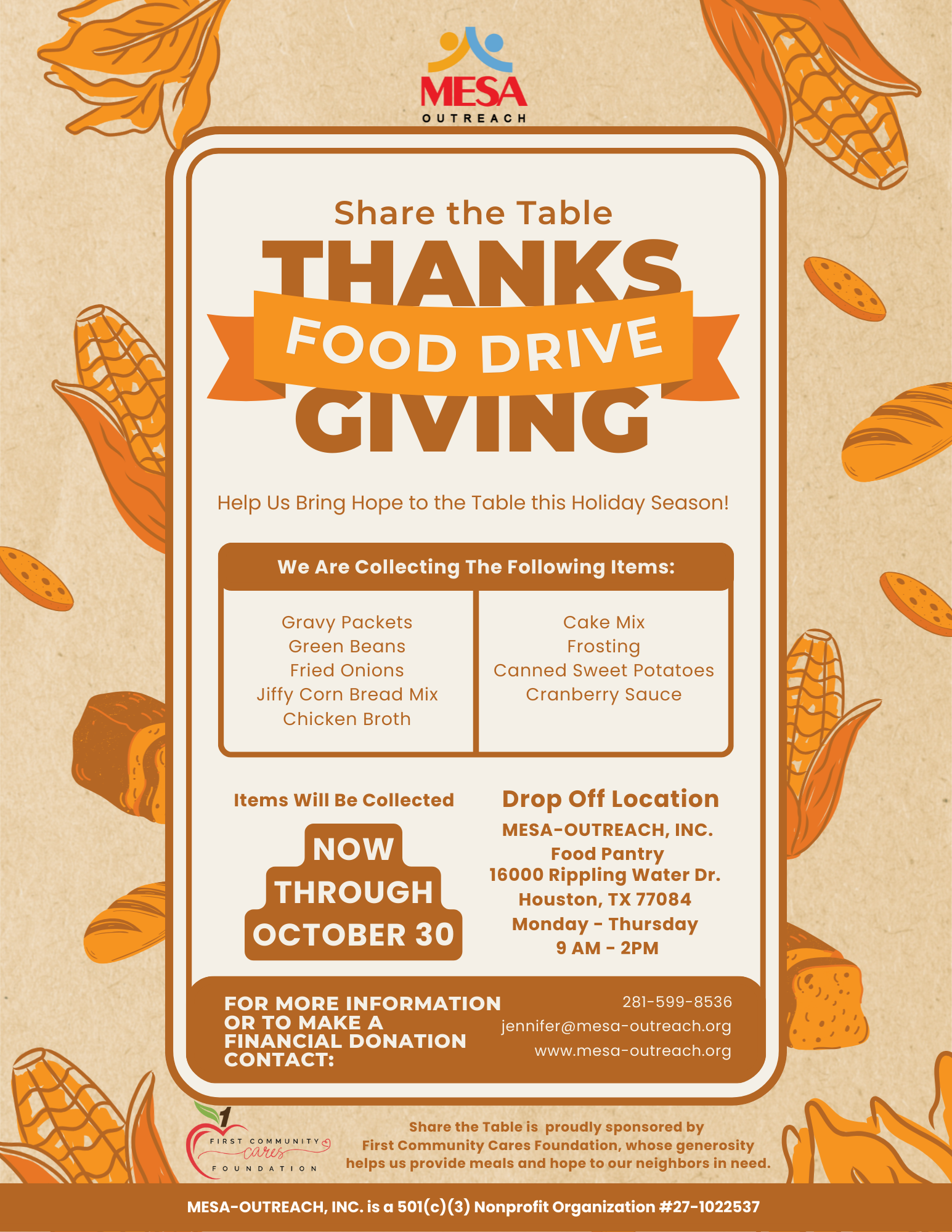 Our Share the Table Food Drive is underway and will run through October 30, 2025. This year, we are preparing to serve more than 300 families with holiday staples, ensuring our neighbors can enjoy a warm and nourishing meal this season.